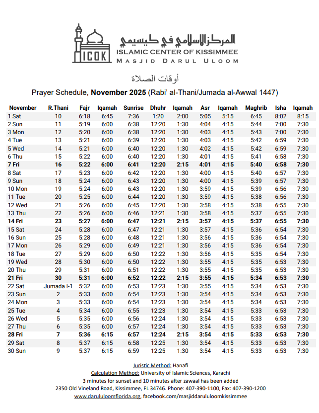 Qur'an Classes Maghrib to Isha on Mondays through Thursdays; 12:00 to Zuhr on weekends